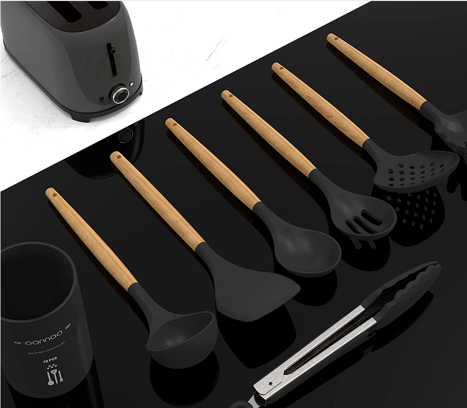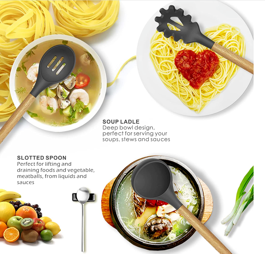 • FULLY MEET THE NEEDS OF THE KITCHEN, NO MORE WASTE OF MONEY - These kitchen utensil sets include 9 cooking tools and 4 baking tools. A large utensil holder. Buy it at one time and get what you need in the kitchen. No more waste of money. Deep Soup Ladle, Solid Serving Spoon, Slotted Spoon, Flexible Spatula, Round Spatula, Pasta Server, Slotted Turner, etc. These silicone kitchen utensil perfectly protect the surface of the non-stick pan from scratches