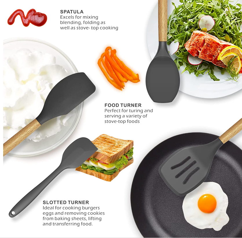 BPA free, food-grade, silicone safe to use for any type of food.With our complete set of cooking utensil set whipping up a delicious dessert is super easy From spoons to spatula