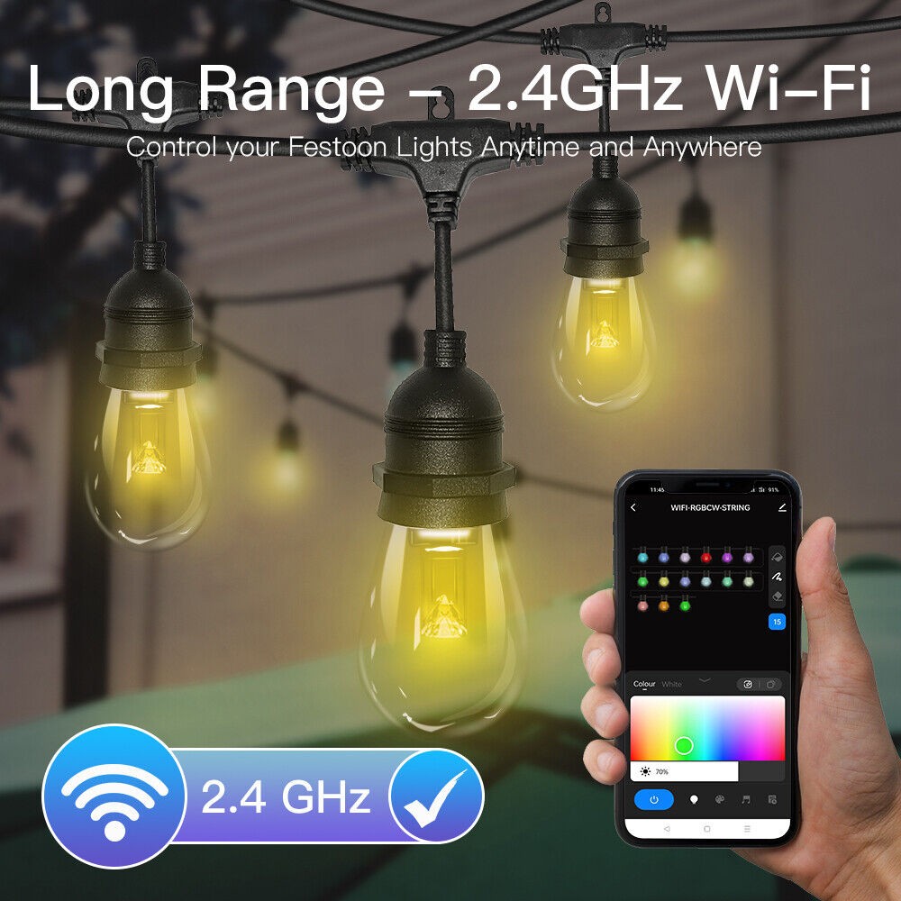 ?Connectable Festoon Lights--- Up to extend connect 3 string lights kits together (Each set 15M/48ft) by Male-Female connector, and up to control 45 Bulbs via WiFi App directly, no need to pair again; Ideal for patio, deck, backyard fence, pergola, porch, bistro, cafe.
