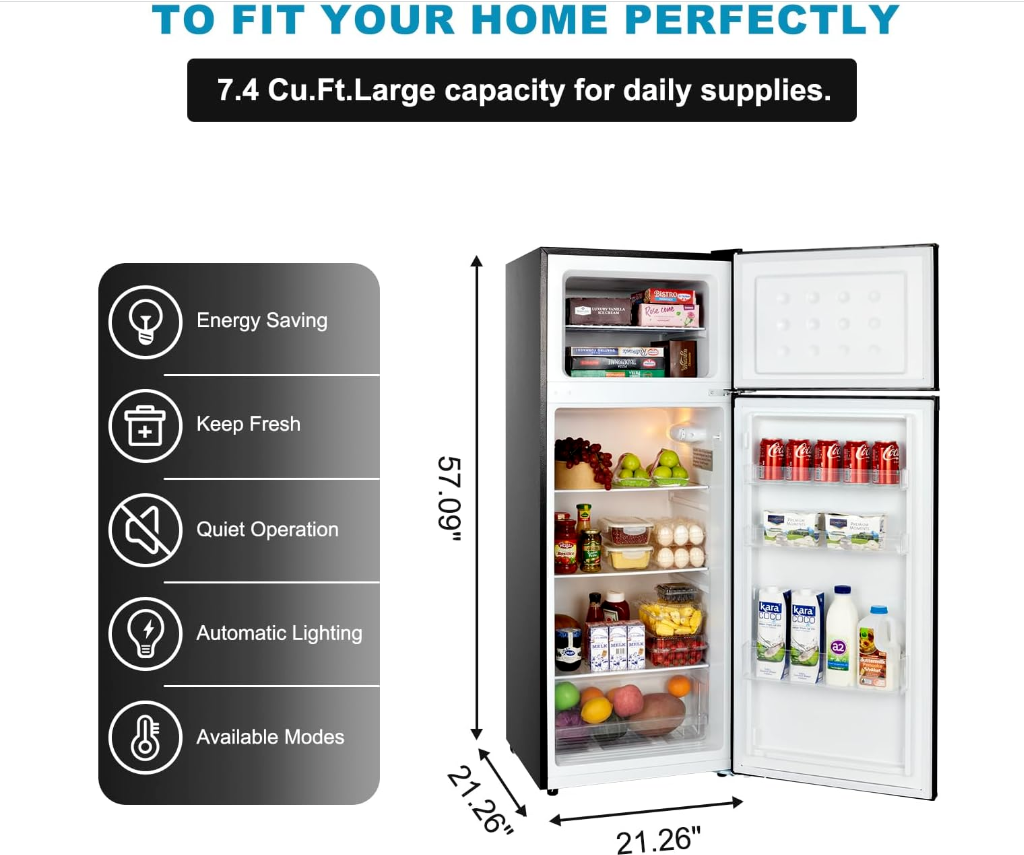 Large in Capacity: No more worries about plenty food from limited space to store them. Our apartment size refrigerator possesses a much deeper and enlarged space of 21.26 x 21.26 x 57.09" with large capacity to keep all your food totally fresh.