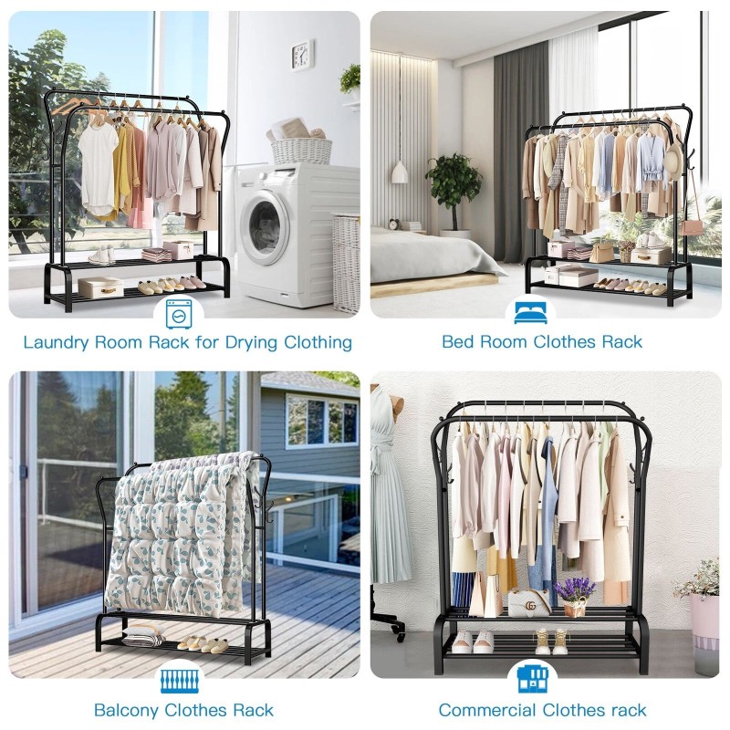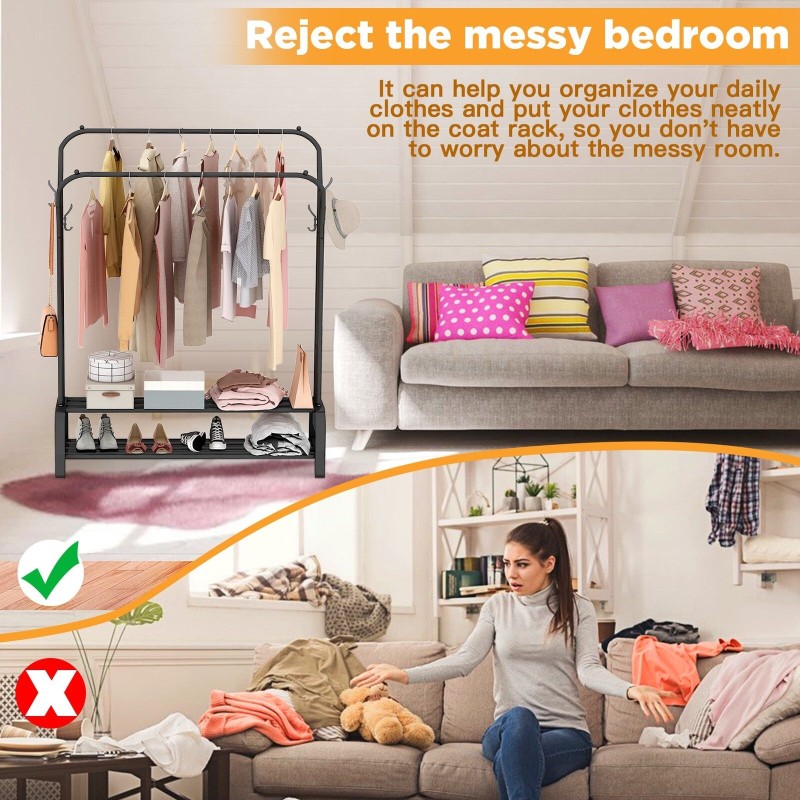 Adjustable, Double bottom shelves,Portable, Heavy Duty, 8 Hangers, 2 Shoe Shelves, Hanging, Large Capacity
