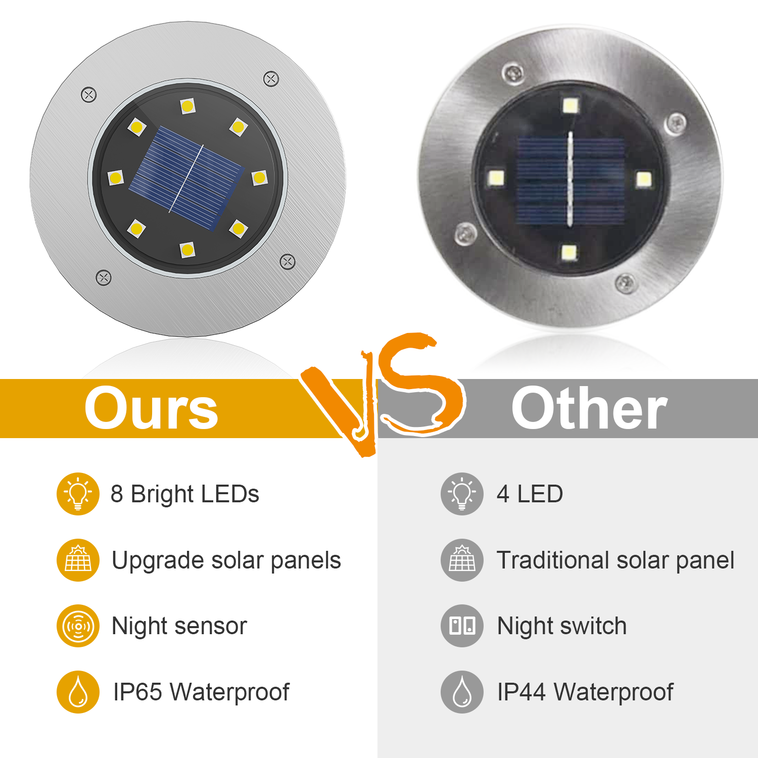 Solar charged: The solar panel can be charged for 6-8 hours under standard sunshine, and can be turned on for 8-10 hours.
