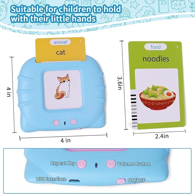 【Easy To Operate】Just insert the card into the reader, it will pronounce the words. When an animal card or transport card is inserted, the card reader will also play lifelike animal or transport' s sound. Press the left button to repeat the pronunciation, press volume button to adjust sound (5 levels).