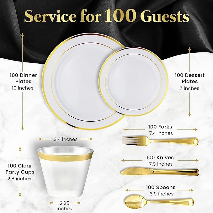 WE STAND BEHIND OUR PRODUCTS: Our high quality gold plastic dinnerware sets offer tremendous value for your gatherings but if for any reason you are not happy with the product please let us know. If any portion of the set is damaged due to shipping, please contact us for FREE REPLACEMENTS of the damaged items.