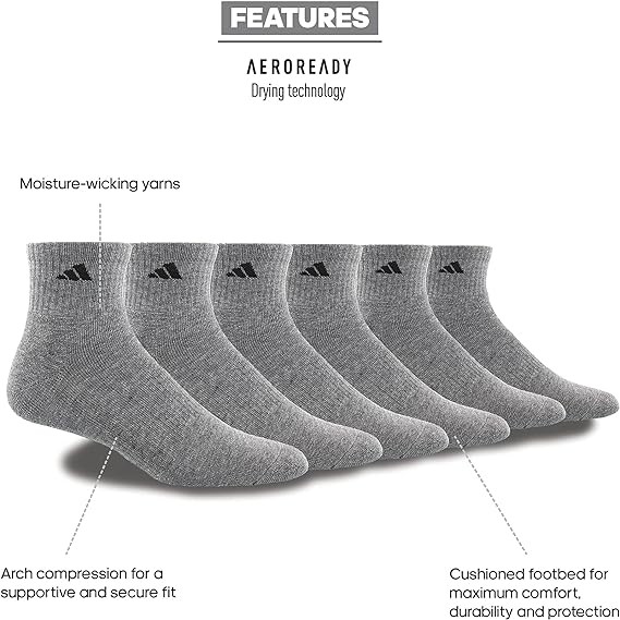adidas Men's Athletic Cushioned Quarter Socks (with Arch Compression for a Secure Fit (6-Pair)