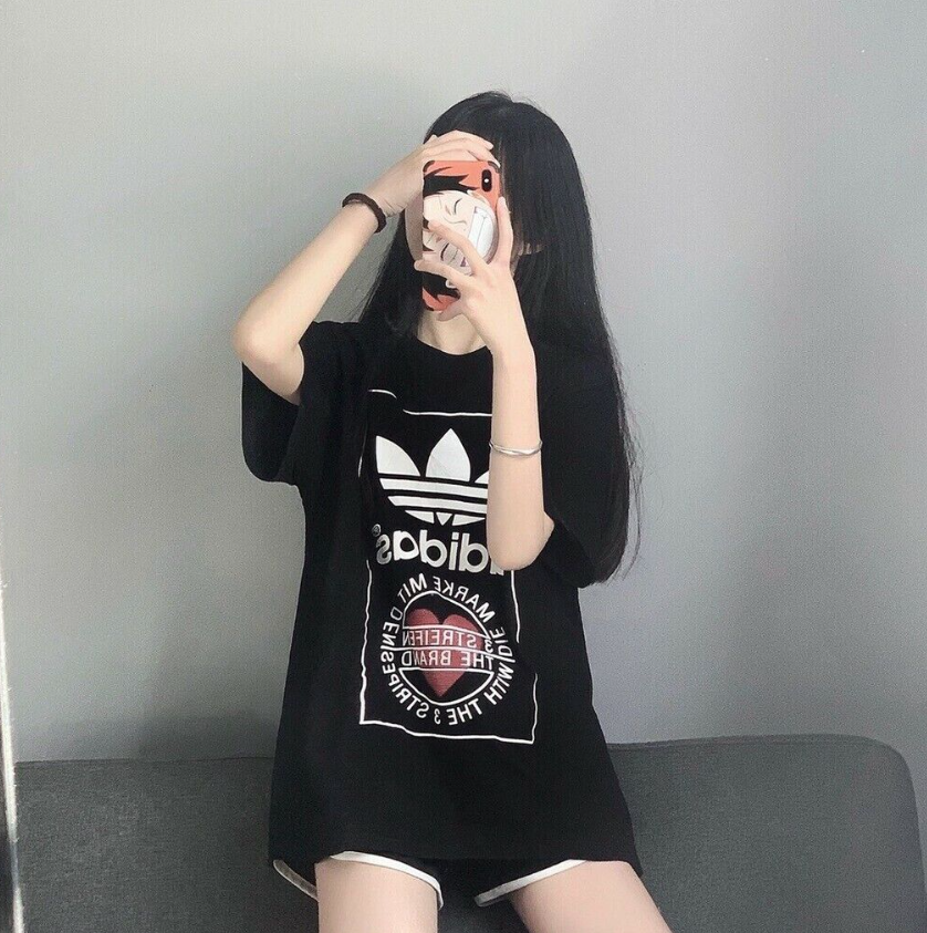 Made from 100% cotton featuring a ribbed neckline, short sleeves and unique heart print added onto Adidas's originals classic logo. This unisex shirt is oversized in fitting and long in length for women, regular fit for men.It is perfect for active wear, or for a casual look.