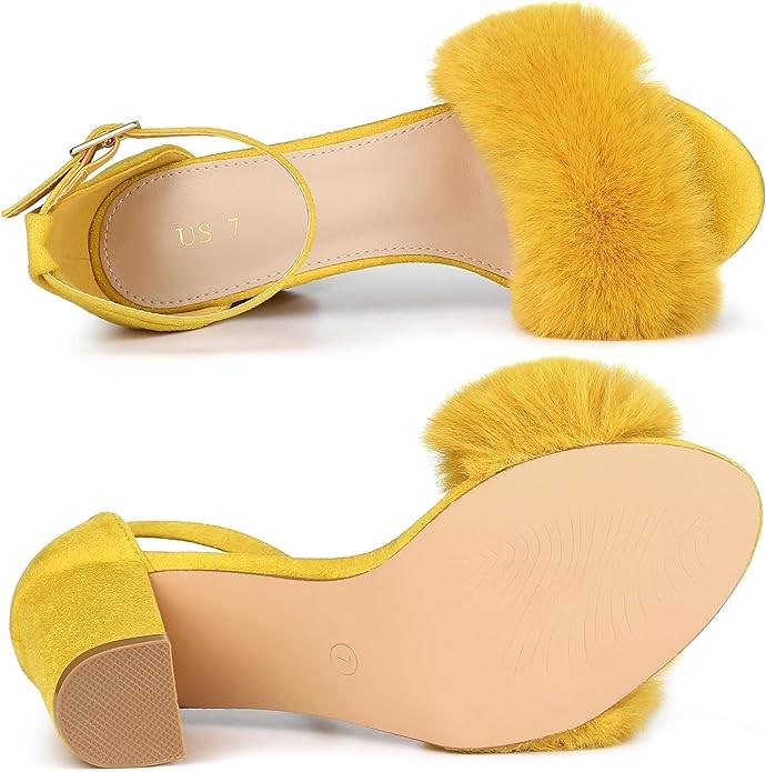 • Faux Suede, Block Heel, Buckle, Open Toe, Faux Fur, Ankle Strap