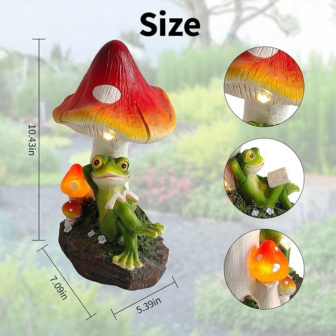 ?Interesting Design: Cute frog leaned against the mushroom to read a book, an LED light directly above the book creating an atmosphere of reading, the frog solar garden statue is hand-painted with very nice details and bright colors. It makes your garden or yard look alive!
