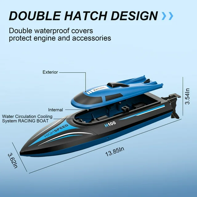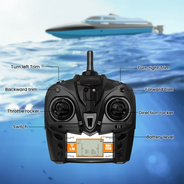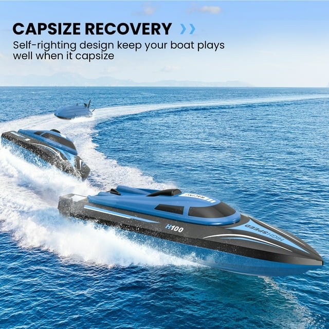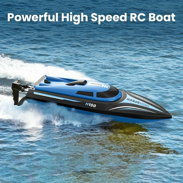 High-speed Remote Control Boat: H100 RC boat for adults and kids races across the water at up to 20 mph. This high-speed boat submarine toy is equipped with a 4-channel 2.4 GHz remote with a 150-meter signal range.