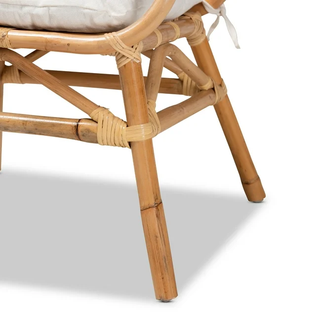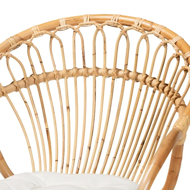 The warm, soothing tones of the Benicia dining chair refresh the mood of any dining room layout. Made in Indonesia, this chair is comprised of a natural rattan frame and includes a plush, fabric upholstered seat cushion. Slim rattan rods are expertly interlaced within the backrest to form a smooth embrace, while convenient armrests offer enhanced comfort. The Benicia will arrive fully assembled and features angled legs for excellent stability and support. Encouraging an air of ease, the Benicia dining chair transforms the atmosphere of any space. Due to the nature of the natural materials used in this product, it may have variations in areas such as, but not limited to, color, pattern, grain and texture. The hair-like strands of rattan/rattan-fiber are common due to nature of the material.