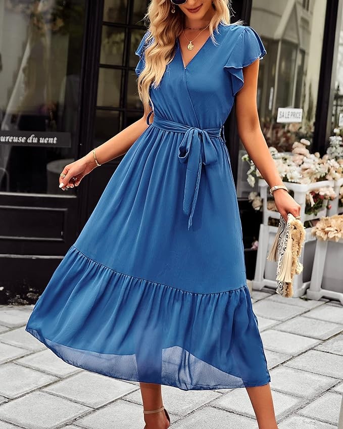 • 【Unique Feature】Ruffle Cap Sleeves, Short Sleeve, Cross V-Neck, High Waist, Allover Floral / Polk Dot Print, Elastic Waistband with Removable Belt, High Split, Above the Ankle Length, Fit And Flare Dress, Tiered Flowy Swing Dress, Wrap Dress, Ruffled Hem A-Line Dress, Midi Long Dresses, Beach Maxi Dresses that Hide Belly Fat.