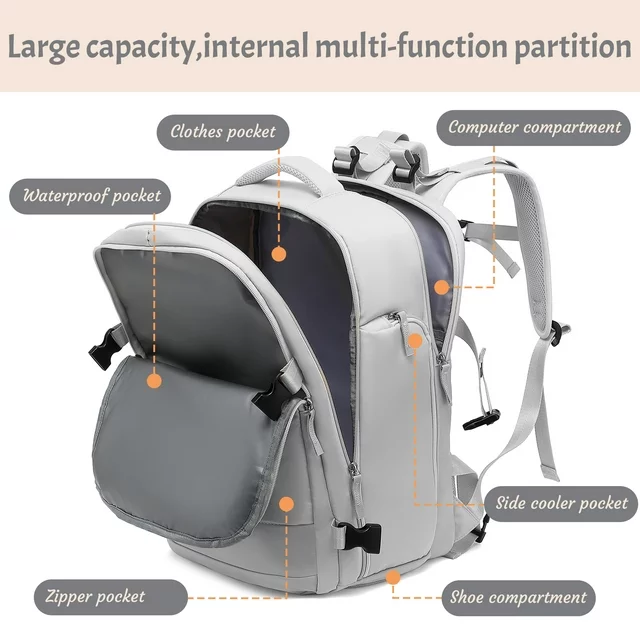 Derstuewe Large Travel Backpack for Women Men, Carry On Backpack for Outdoor Sports , Waterproof Laptop Bag with USB Charging Port, Backpack Flight Approved,Grey