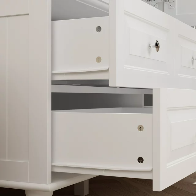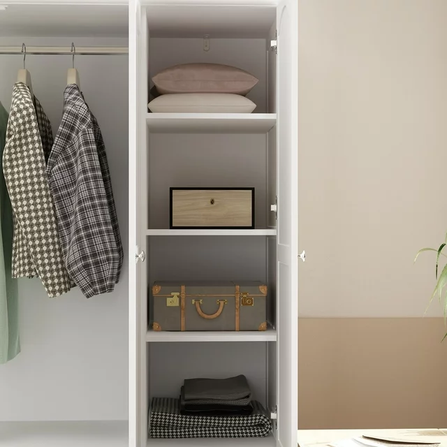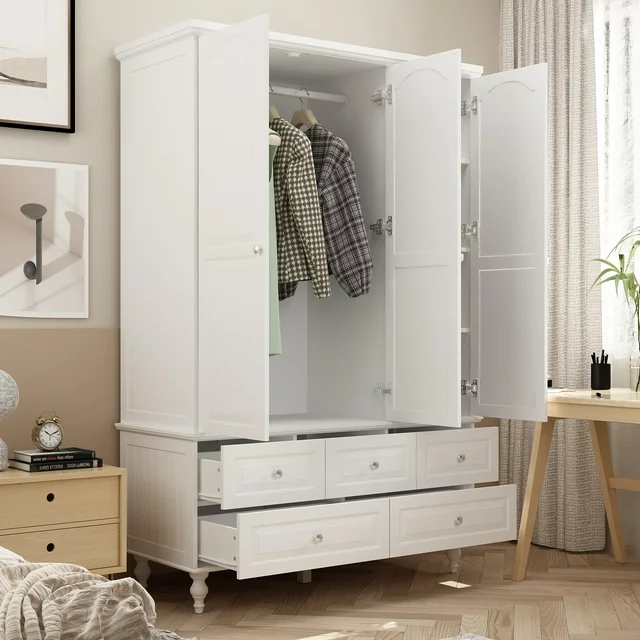 The 3 Door Armoire is the ideal solution to add storage space in the bedroom while also enhancing the decor. Made from premium quality materials, the armoire is quite durable and sturdy.The 3 Door Wardrobe features hanging rods inside the cabinet lets you hang more wrinkle-prone pieces. There are four shelves to store bag. The 3 Door Wardrobe is divided into two parts once part is a 2-door cabinet offers a hanging rod and the other cabinet with four shelves( fixed and flexible shelves) can be adjust to meet different hight. The five bottom drawers gliding on metal slides provide spacious storage for you can keep your blouses, T-shirts , pajamas ,jeans, sweaters neatly and stay where it belongs This Armoire is ideal for bedrooms with contemporary decors. The bottom compartment of the armoire offers The silver handles complete the piece with polish and add accessibility. It is easy to care for and can be wiped clean with a dusting cloth. Plus, one door boasts a mirrored front, allowing you to check your look before taking on the day. Crafted from premium MDF in white Finish, this cabinet is perfect for any contemporary, modern, cottage, shabby chic or casual spaces.