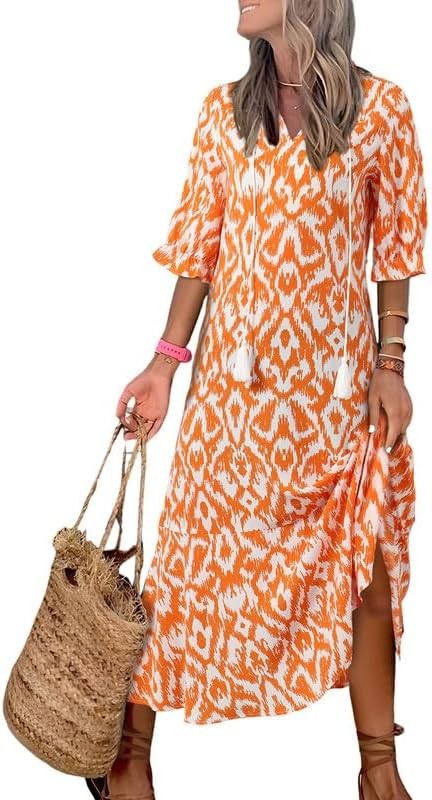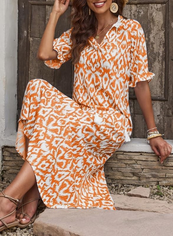• Unique Features-Boho Dress for Women/Maxi Dress/Flared Short Sleeves Summer Dress for Women/V Neck Long Dress/Ruffle Hem/Beach Maxi Dresses for Women Summer/Tassel V Neck/Casual Geometric Print Dress/Casual Summer Dresses/Frill Sleeve/Stand Neck