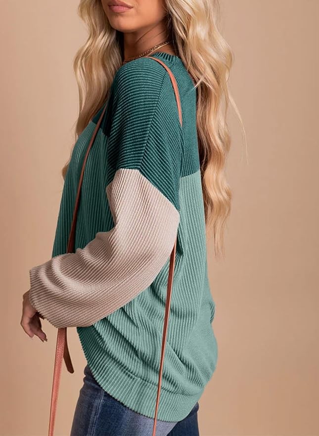 Dokotoo Womens Fashion 2024 Color Block Long Sleeve Crewneck Knitted Casual Loose Pullover Shirts Tops