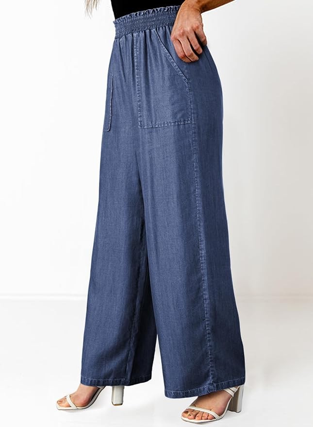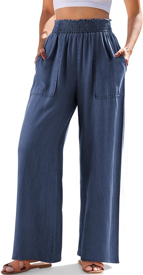 Dokotoo Womens Ruffled Smocked High Waist Slant Pocket Straight Tencel Denim Jeans Summer Lightweight Pants