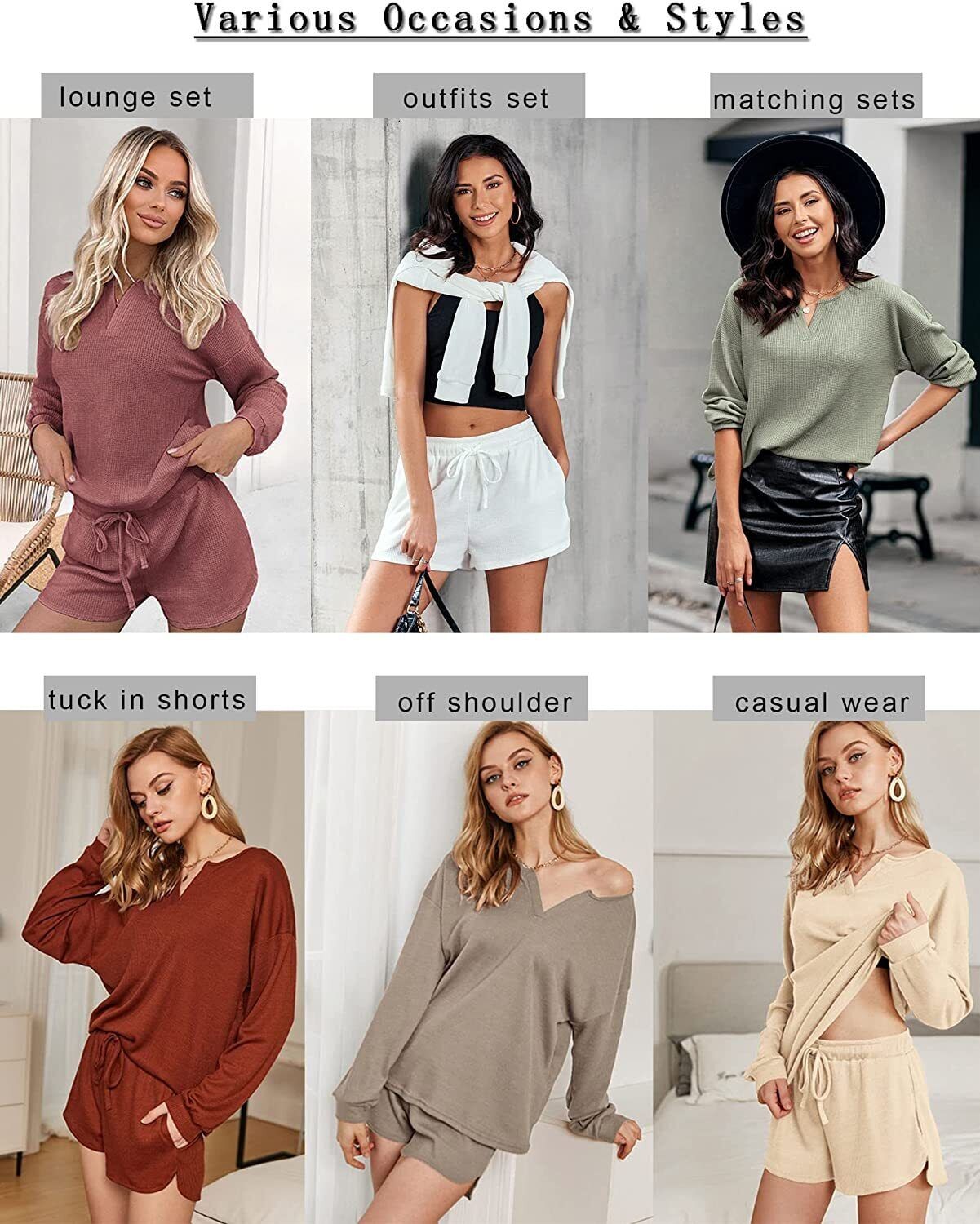 Ekouaer Pajamas Womens Waffle Knit Lounge Set Long Sleeve Top and Shorts 2 Piece