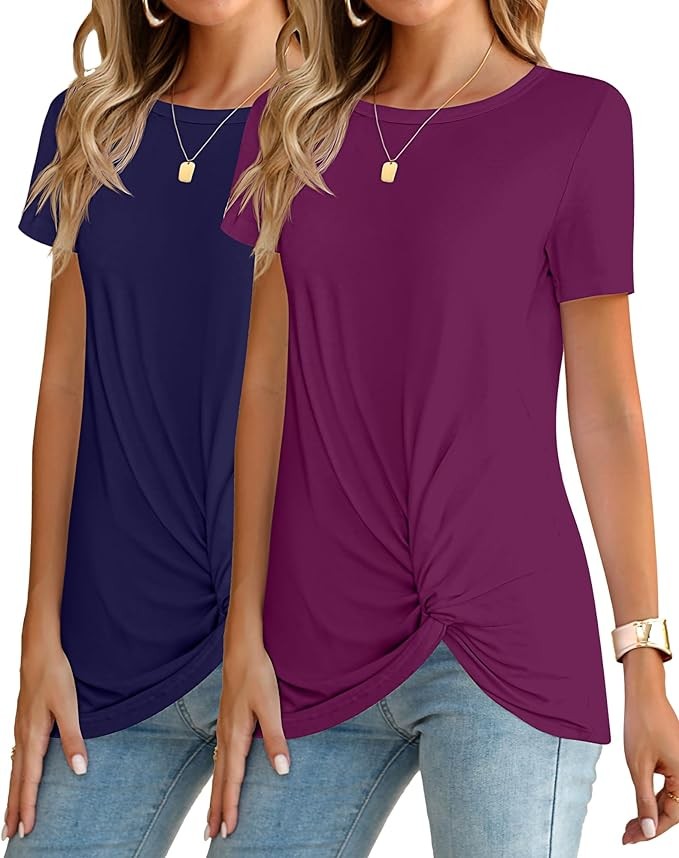 Ficerd 2 Pcs Women's Casual Summer Shirts, Twist Knot Tunic Tops Short Sleeve Tees Crew Neck Blouses Loose Comfy T Shirt