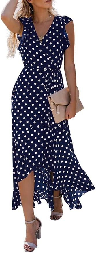 • Features: Floor length summer floral print Maxi dress, you will look vibrant and alive, stylish and elegant in it. Cross v neck, ruffle cap sleeves, short sleeves, elastic waistband. Slim fit will show off your shapely curves well. Irregular high low hemline, as if the lotus leaf is swaying, wearing it will want to start a romantic journey.