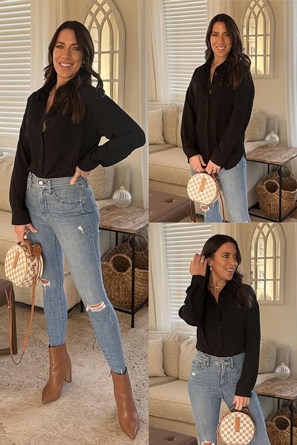 • ❤Unique Design Button Down Blouse: The classic women's button down shirt, long sleeve(can also be worn as 3/4 sleeves), special wavy texture, drop shoulder, full button front, V neck collared, with covienien pocket, boyfriend loose fit to casual style for an effortlessly chic outfit! It has easily become one of your closet staples.