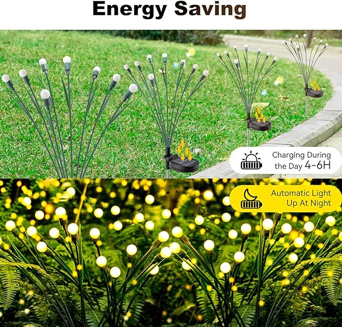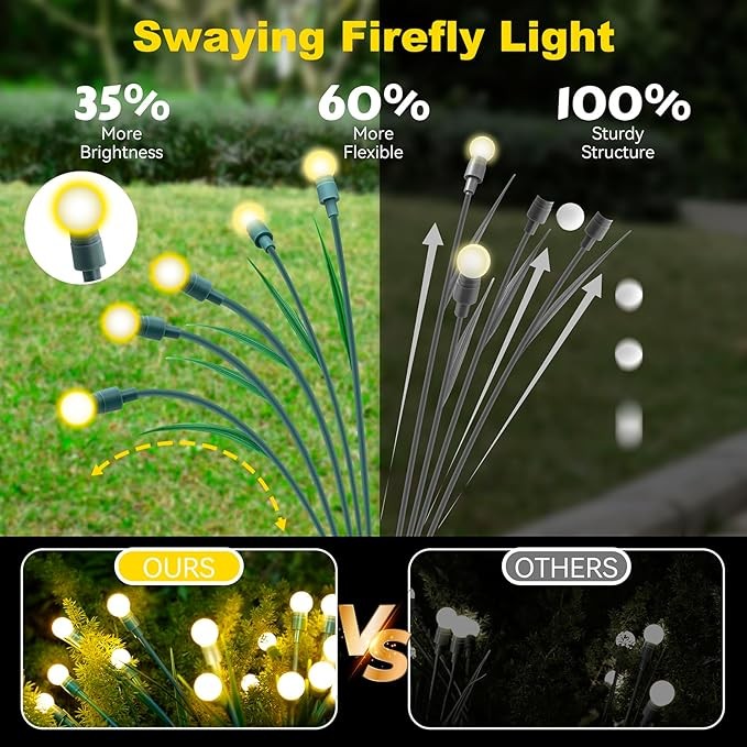 • 【Upgraded Version of Firefly Light】Solar powered outdoor firefly lights have been upgraded! Differing from ordinary firefly light, this one is designed with green leaves and more lamps, making it better integrated into the garden environment, more natural and more bright. Swaying in the wind like a clutter of fireflies dancing in the grass.