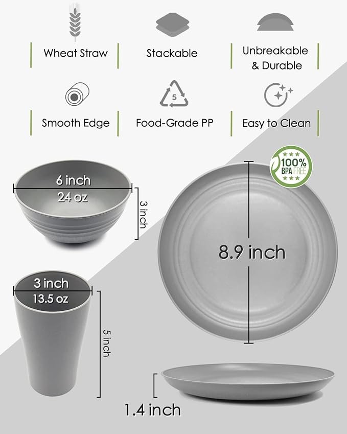 • Package Includes - 12-Piece dinnerware set with 4 wheat straw dinner plates, 4 unbreakable bowls, and 4 unbreakable cups, service for 4. 100% refund or replacement guarantee, contact us if you have any problem.
