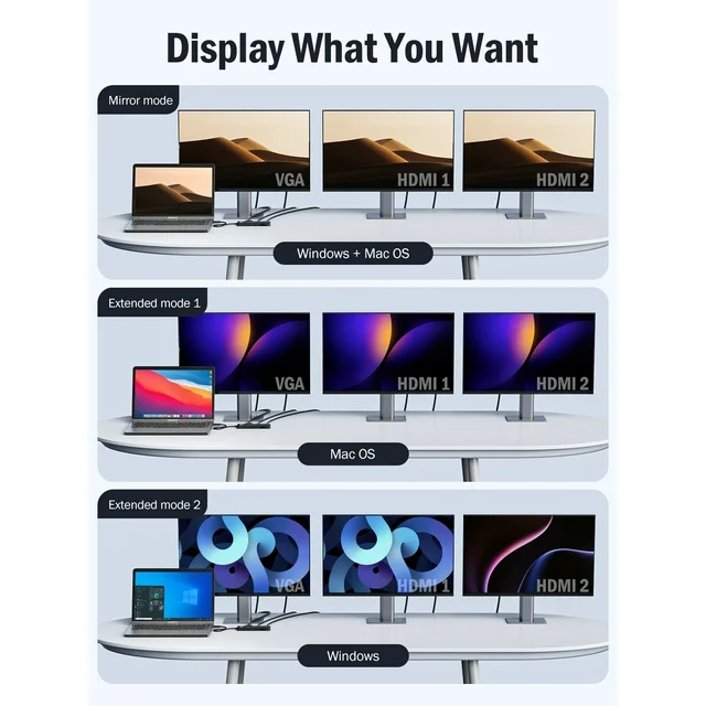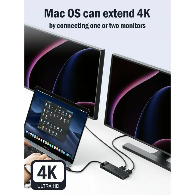 • 【4K HDMI to USB C Hub】2 HDMI ports of this hub supports up to 4K@30Hz, which can perfectly mirror or expand your screen to HDTV, monitor, projector.