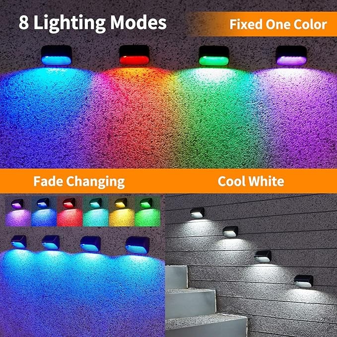 【8 Lighting Modes Solar Fence Lights】 LETMY solar fence lights outdoor provide 8 modes: Cool white, RGB Fade, and 6 Solid Colors. The solar lights outdoor multi-colored changing mode is perfect to meet your holiday or party decor needs. The cool white mode of fence lights solar powered is ideal for daily lighting. Most importantly, you can freely select and fix your favorite colors of the solar lights for outside, match the lighting colors and display them in your backyard.