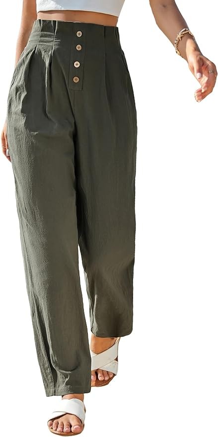 MakeMeChic Women's Casual Solid Linen Paperbag Waist Lounge Pants Button Pleated Tapered Trousers Pants
