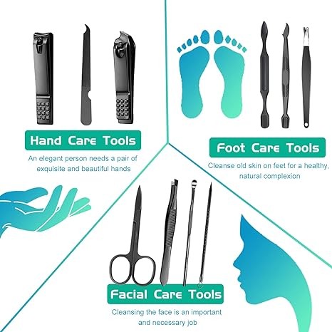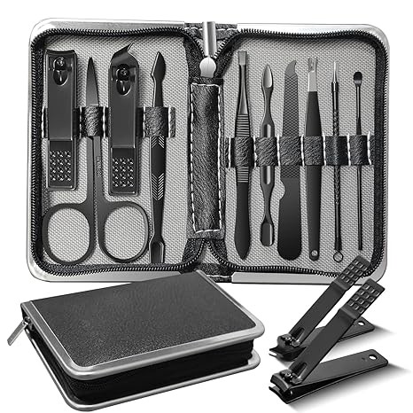 • ⭐GROOMING KIT?Professional manicure set Includes straight edge nail clippers, multi-purpose scissors, slanted edge clippers, tweezers, nail file, scraping tool, cuticle stick, V-shaped push stick, needle and loop blackhead remover, and ear pick,This men's grooming kit is perfectly suited for your daily hygiene needs.