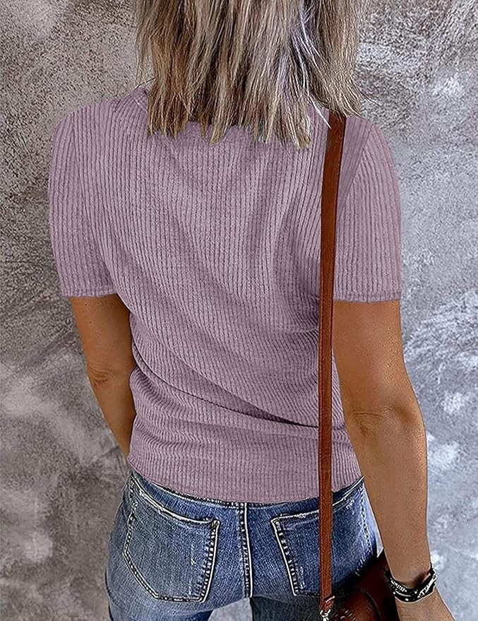 • The summer basic short sleeve solid color top looks simple but cute. The ribbed knit material will make you look slim, and the buttons and V-neck will make you look sexy. It's super easy to wear and looks classy with jeans and sneakers.