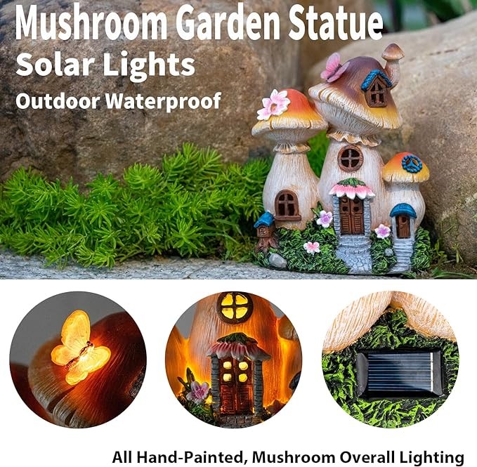 • Weather-Resistant: Each solar Mushroom Garden Statue is hand-painted vibrant colors with great details. Every part is made of long-lasting resin, hand painted with UV resistant paint, making it solid and lasting. no worries about rain, snow, frost, sleet.Perfect for your garden。