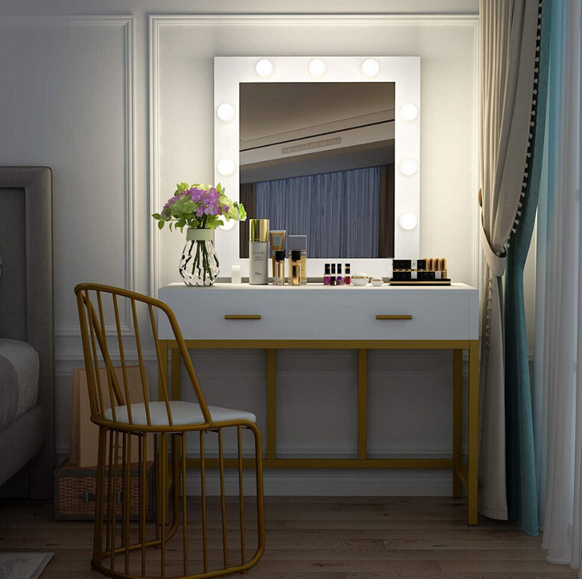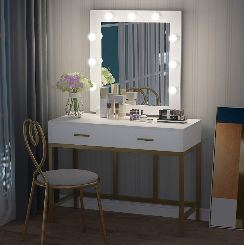 • DURABLE AND AESTHETIC: Crafted from strong golden metal frame (0.98 inch) and E1-graded MDF wood, this makeup vanity with lights takes on both contemporary and classic silhouette in your home and serve you for years to come.