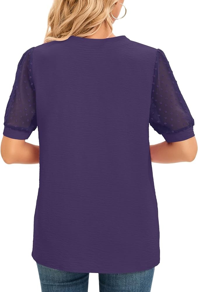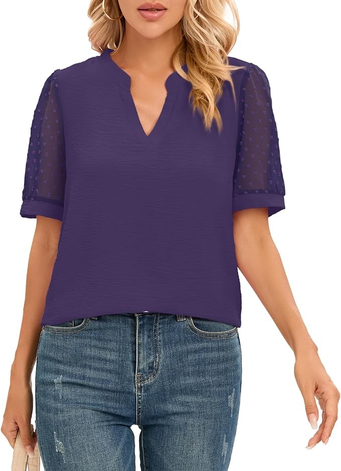 • Features: This tops has a trendy notch V-neck design with semi transparent chiffon short sleeves and a loose design. That allows you to be comfy, stylish and feeling confident. This trendy tops is the perfect length to pair with leggings, jeans, shorts, dress pants, skirts, or capris for a stylish look all year round!