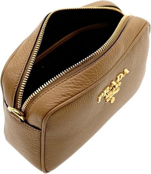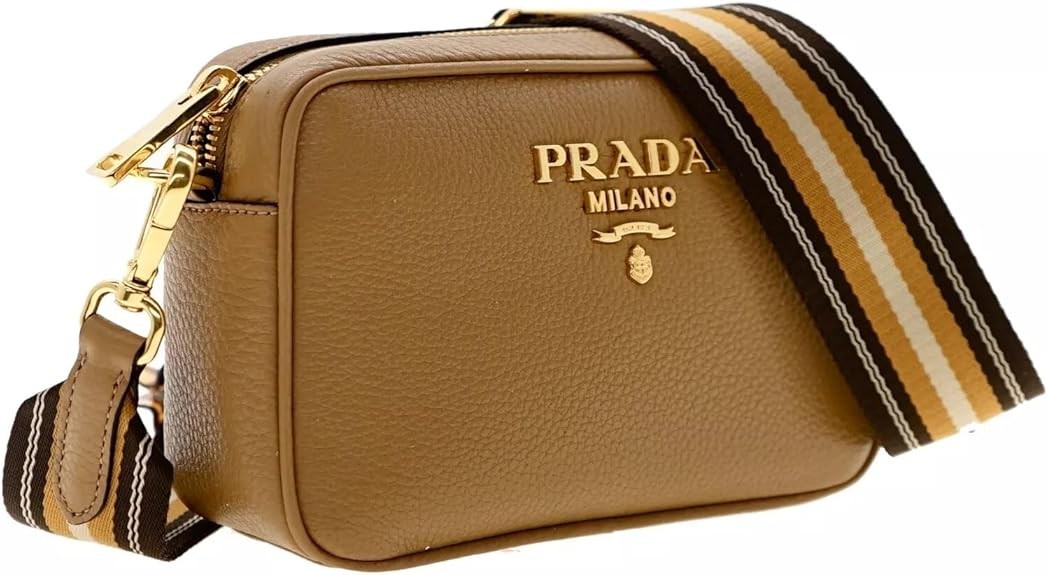 • Stylish Crossbody: This Prada crossbody bag features a pebbled leather exterior in a rich caramel tan hue with a striped adjustable strap for a chic, on-trend look.