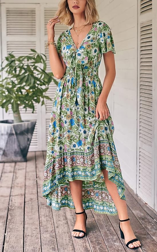 • HIGHLIGHTS: Short sleeve holiday dresses for women 2023 feature feminine vibrant floral print, tie knot front, deep v neck, elastic high waist and high low hem with boho patchwork. A bohemian floral print maxi dress are so summery for any summer event; The elastic high waisted women dresses can easily slender your physique and optimize your body proportion; And the fabric and design are so comfortable and flattering as spring/summer wedding guest dresses for women