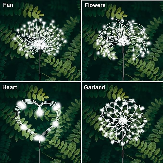 • ✬ 8 Lighting Model-- Decorative firework light can be adjusted in 3 brightness and 8 modes, you can use the remote control to choose your favorite light mode. There is an automatic light sensing function in the garden light, which automatically charges in the sun during the day and automatically lights up and flashes at night.
