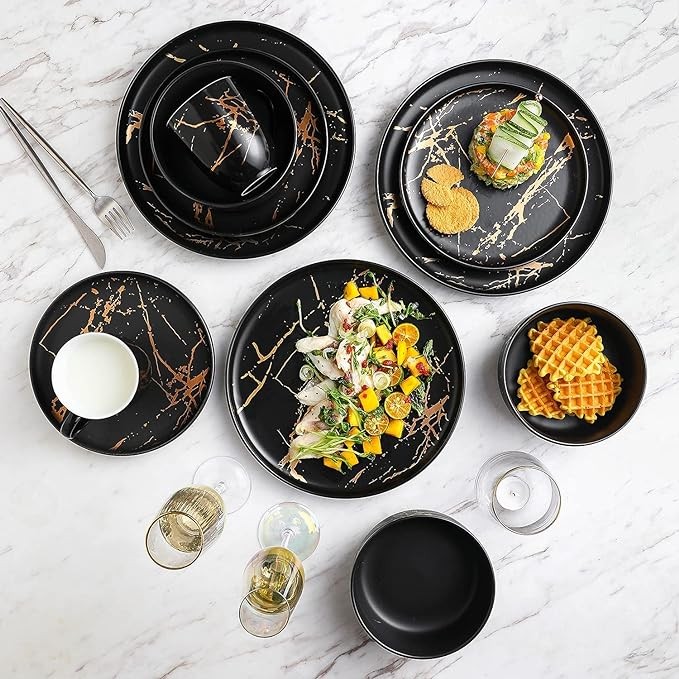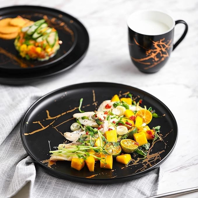 • 16 Piece Dinnerware Set – Sleek black porcelain dining sets, with a hot splash of gold. Includes 4 round dinner plates, 4 salad plates, 4 bowls and 4 mugs