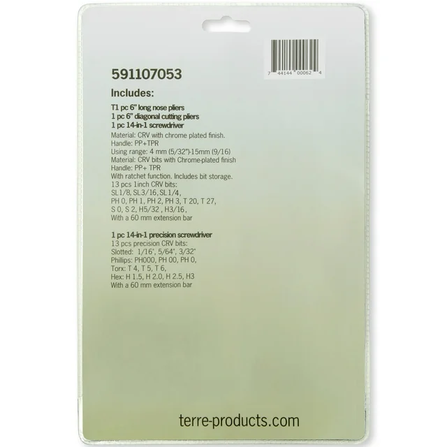 • 14 in 1 screwdriver with 13 bits : Slotted 1/8" , Slotted 3/16", Slotted 1/4" ; Phillips #0, Phillips #1, Phillips #2, Phillips #3 ; Torx #20, Torx #27 ; S #0, S #2 ; Hex 5/32", Hex 3/16". Includes a 60mm extension bar.