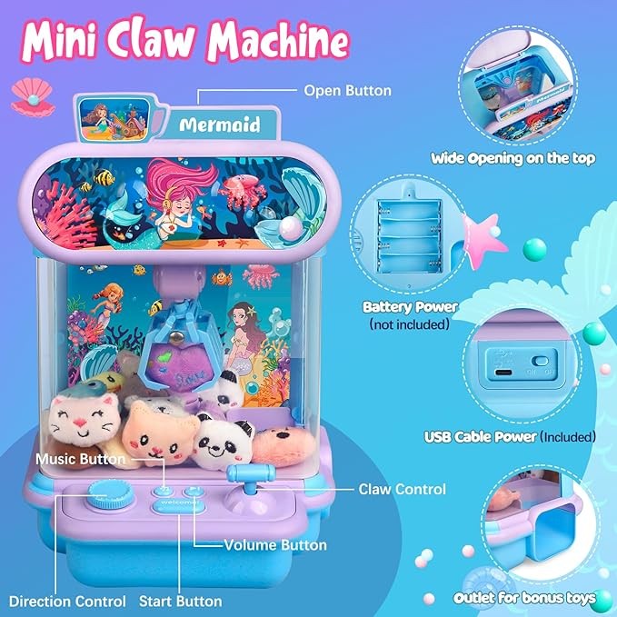 • 【 Mermaid-themed Claw Machine】 - Dive into a world of enchantment! Children will gather around this mermaid-themed arcade claw machine, embarking on a whimsical journey to see who can capture the most enchanting prizes. A splendid choice for a home mini-version of an arcade claw machine, complete with 20 randomly selected mini mermaid plush toys.