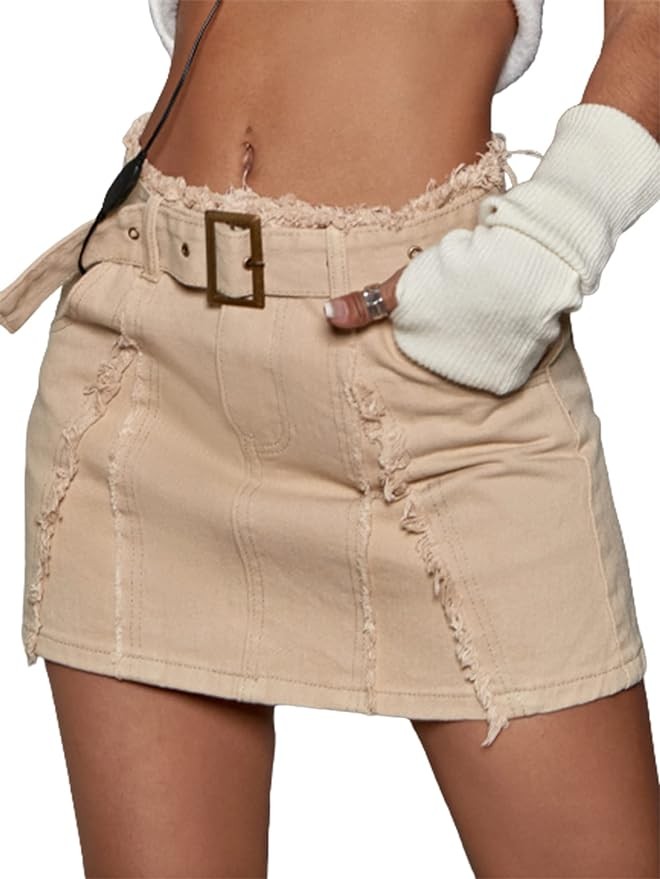 • Feature: High waist, zipper and button closure, buckle belt, frayed hem, casual denim mini skirt