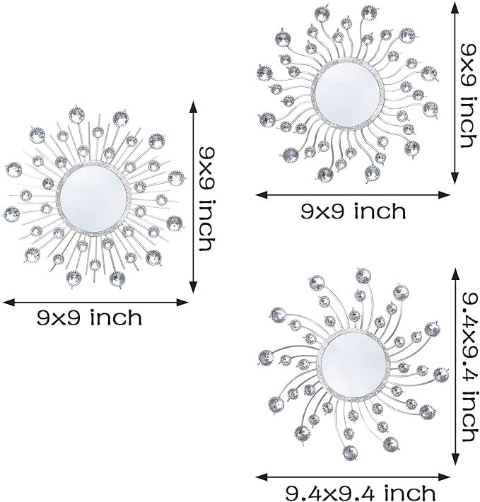 • 【Mirror on the wall】The silver mirror wall decoration consists of three different sun shapes, The beautiful combination of mirrors can be hung in the living room, bedroom, dining room, hallway entrance, bathroom passage, making your wall bright and unique.